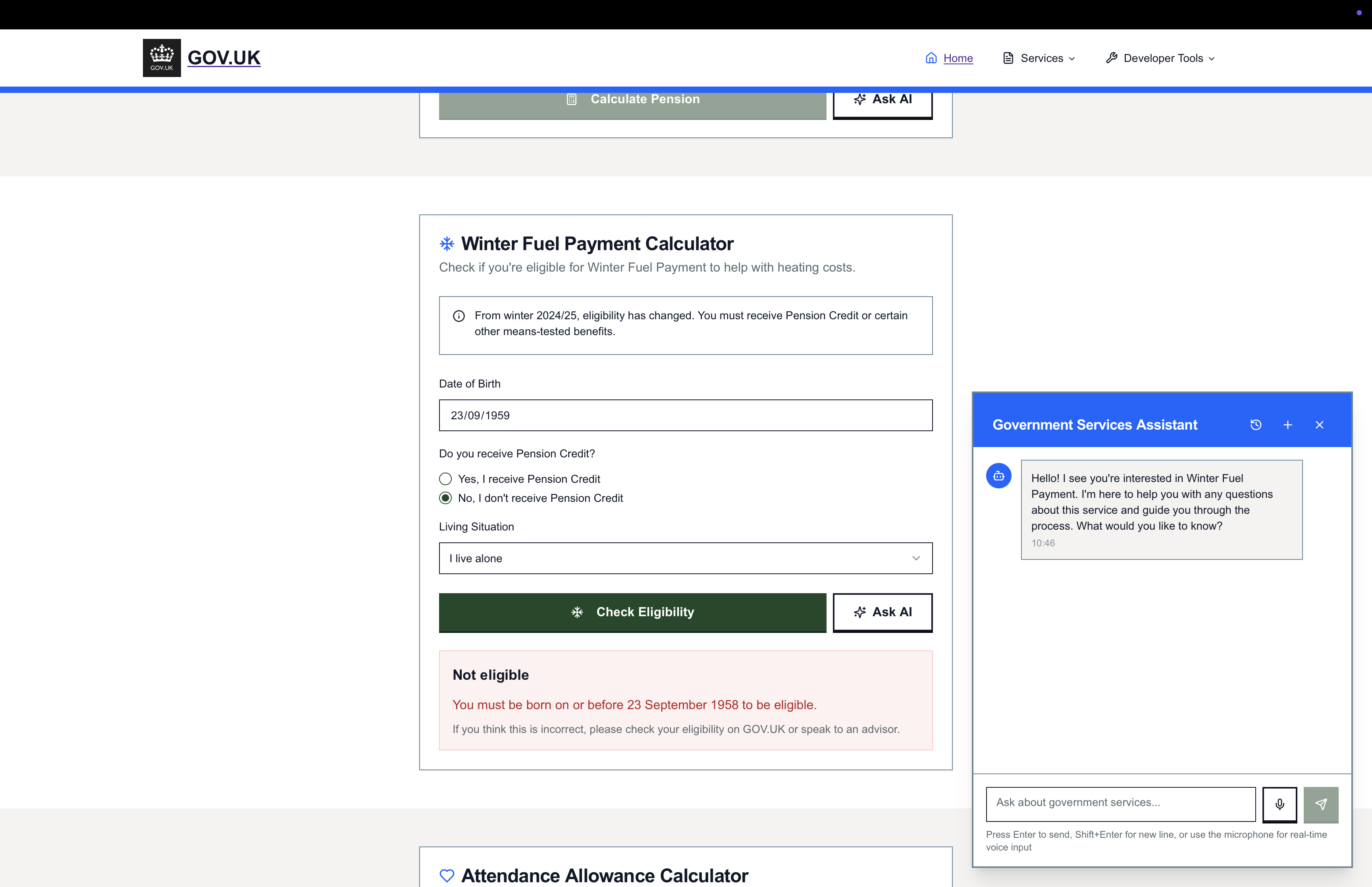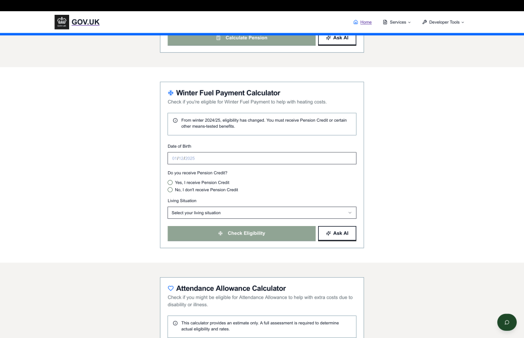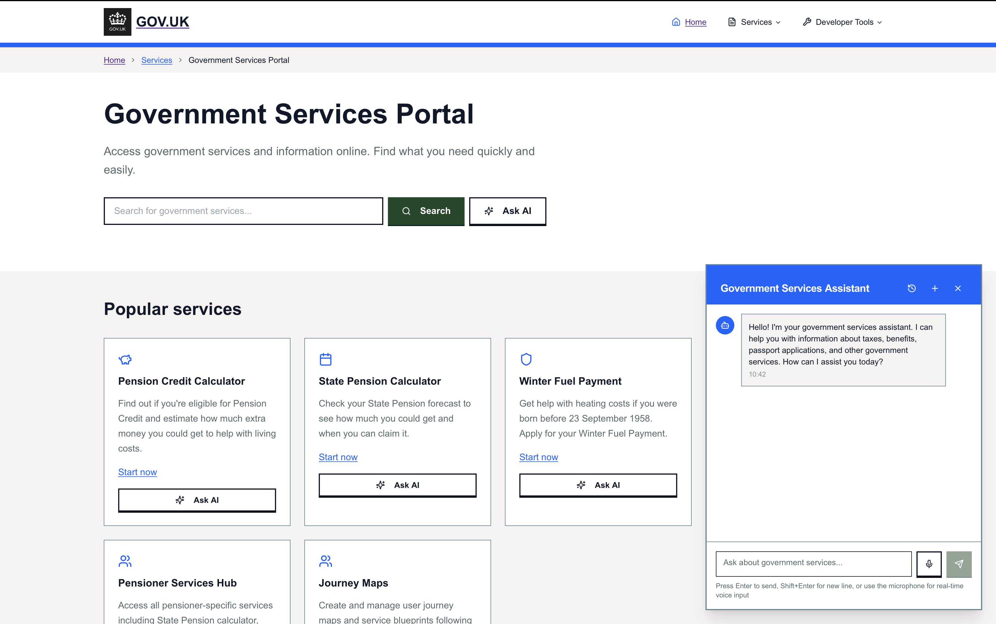 We designed the service using established GOV.UK standards for accessibility, policy fidelity, auditability, and user-centred design. The agent was tested with users performing realistic tasks that would normally require multi-page journeys. We used a range of GenAI tools, agents and engineered prompts to reduce the design and iteration cycle.